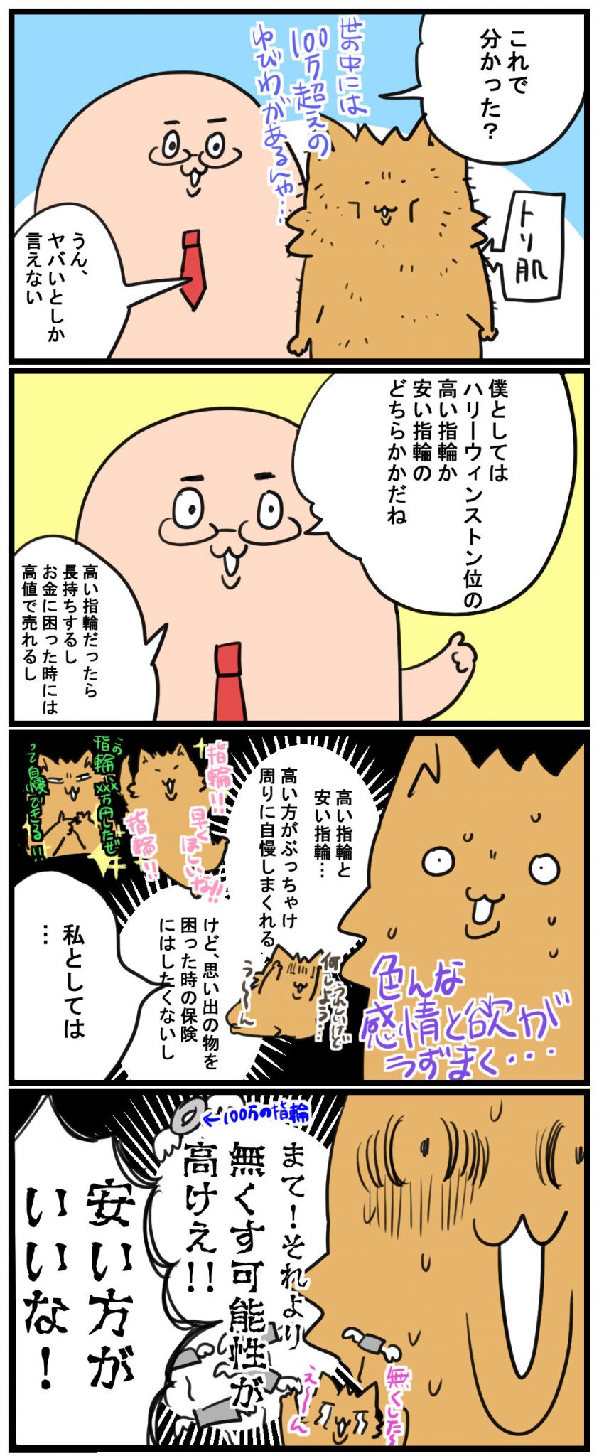 HOME > 恋愛ネタ > 結婚する前 > トモ氏 恋愛ネタ 結婚する前 安い指輪にした理由 2019年5月2日 Post Share Pocket Hatena LINE URLコピー 【前回の話】 にゃんこ氏の結婚指輪は某有名文房具メーカー 「結婚指輪って色々あるんだな」 安い指輪でも無くした時のダメージデカそうなのに たっけえ指輪はどんだけダメージデカいんや… 【前回の話】 にゃんこ氏の結婚指輪は某有名文房具メーカー 「結婚指輪って色々あるんだな」 関連記事 IT企業社長・トモ氏と出会うまで 読んでいただきありがとうございました! ブログランキングに参加しています。 よろしければ押してくれるとうれしいです! 絵日記ランキング Post Share Pocket Hatena LINE URLコピー おすすめ記事 -トモ氏, 恋愛ネタ, 結婚する前