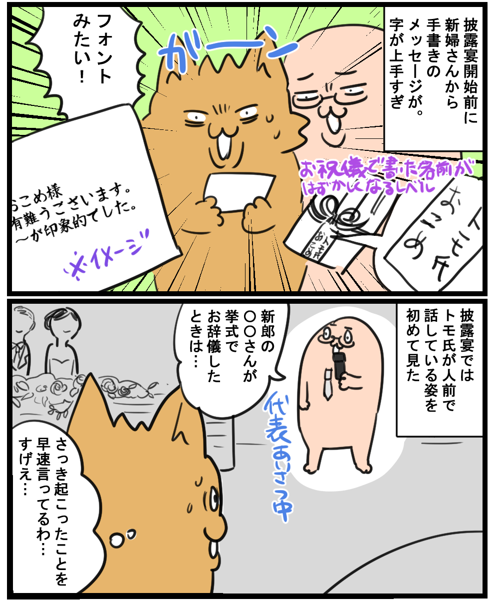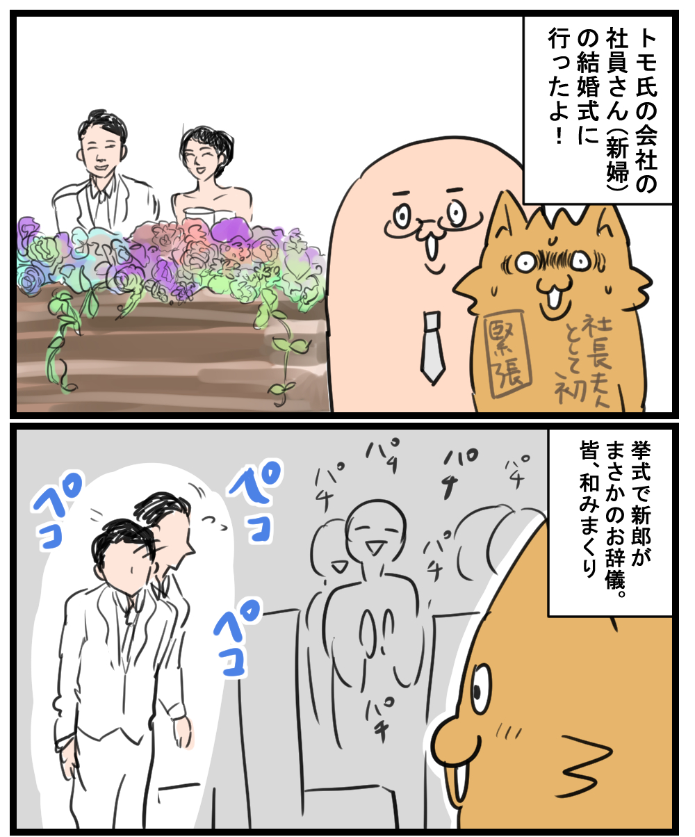 HOME > トモ氏 > トモ氏 結婚式に行った話① 2019年7月29日 Post Share Pocket Hatena LINE URLコピー 数回結婚式に参加したけど お辞儀する新郎は初めて見たよ なんでバージンロードを歩く姿を見ると 涙腺が緩むよね 地味につづく 読んでいただきありがとうございました! ブログランキングに参加しています。 よろしければ押してくれるとうれしいです! 絵日記ランキング Post Share Pocket Hatena LINE URLコピー おすすめ記事 -トモ氏 -おこめ, トモ氏, 結婚式