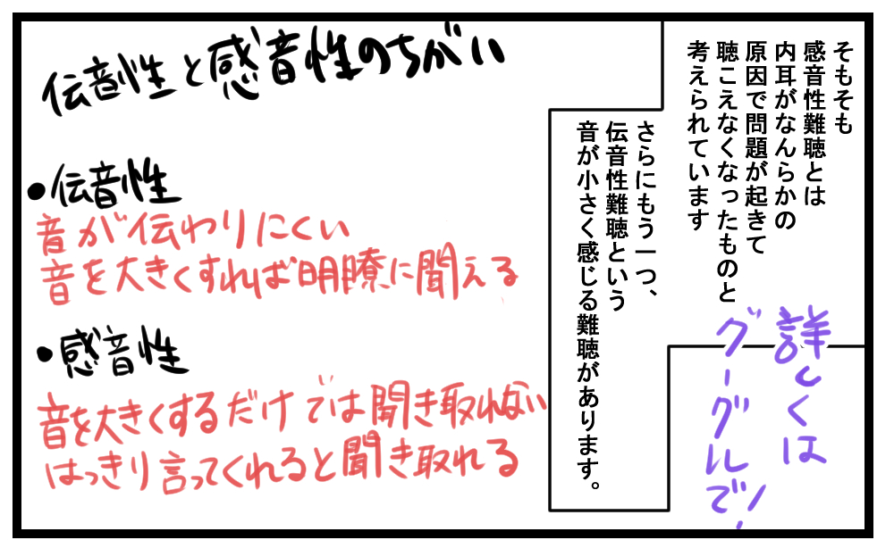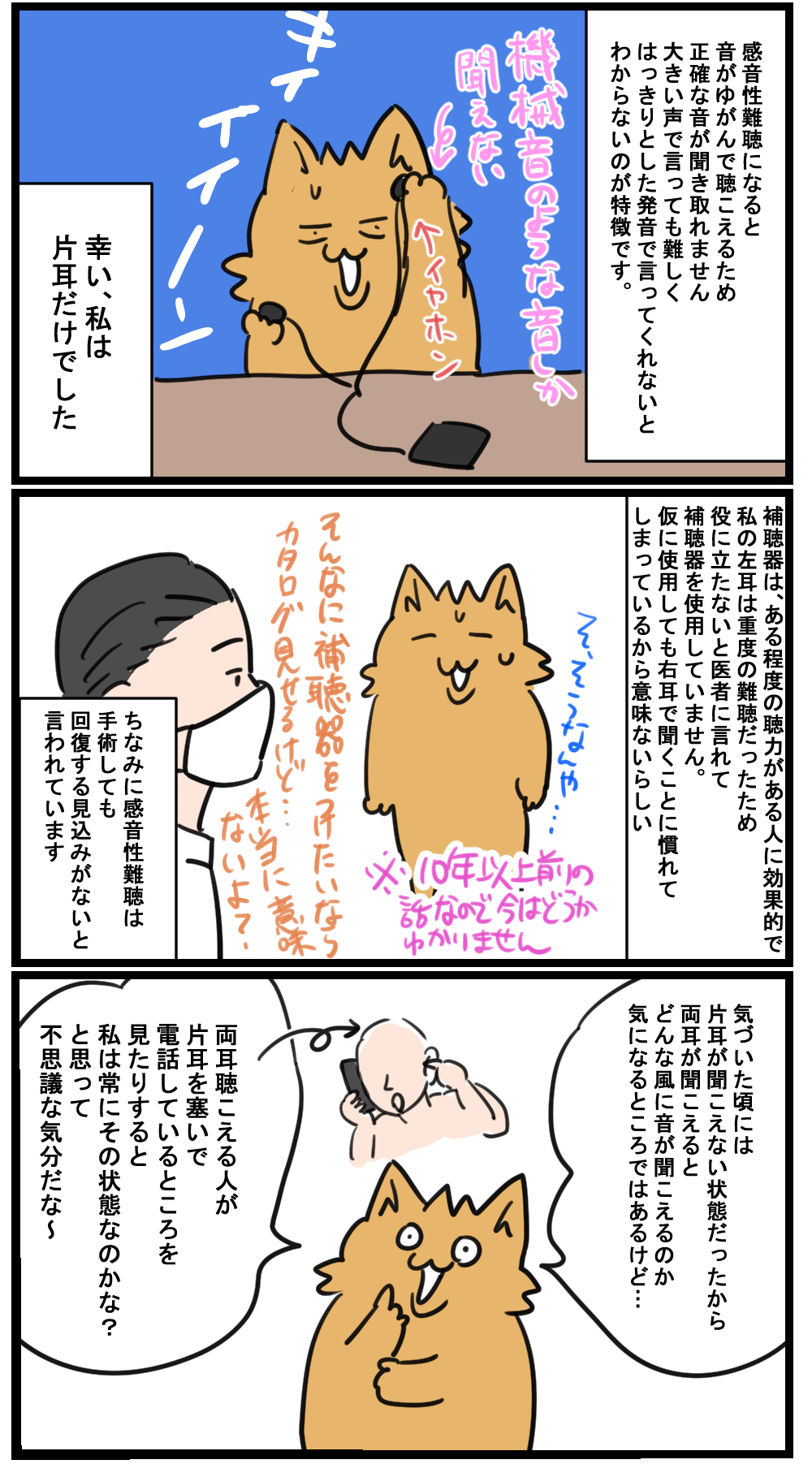HOME > 片耳難聴の話 > 片耳難聴の話 難聴編 ~感音性難聴とは~【1話】 2019年8月31日 Post Share Pocket Hatena LINE URLコピー 【前回の話】 おこめは片耳が聞こえない 【プロローグ】 他にも混合難聴や神経性難聴等もありますが、 専門家ではないので、よくわからず… 今回は伏せさせていただきます…すいません 詳しくはネット等で調べてくださいね! ↓最初からの話 [blogcard url="https://www.comeoishii.com/2019/08/28/post-1328/"] 【前回の話】 おこめは片耳が聞こえない 【プロローグ】 読んでいただきありがとうございました! ブログランキングに参加しています。 よろしければ押してくれるとうれしいです! 絵日記ランキング Post Share Pocket Hatena LINE URLコピー おすすめ記事 -片耳難聴の話 -おこめ, おこめは片耳が聞こえない, シリーズもの, 左耳難聴, 片耳難聴, 突発性感音性難聴