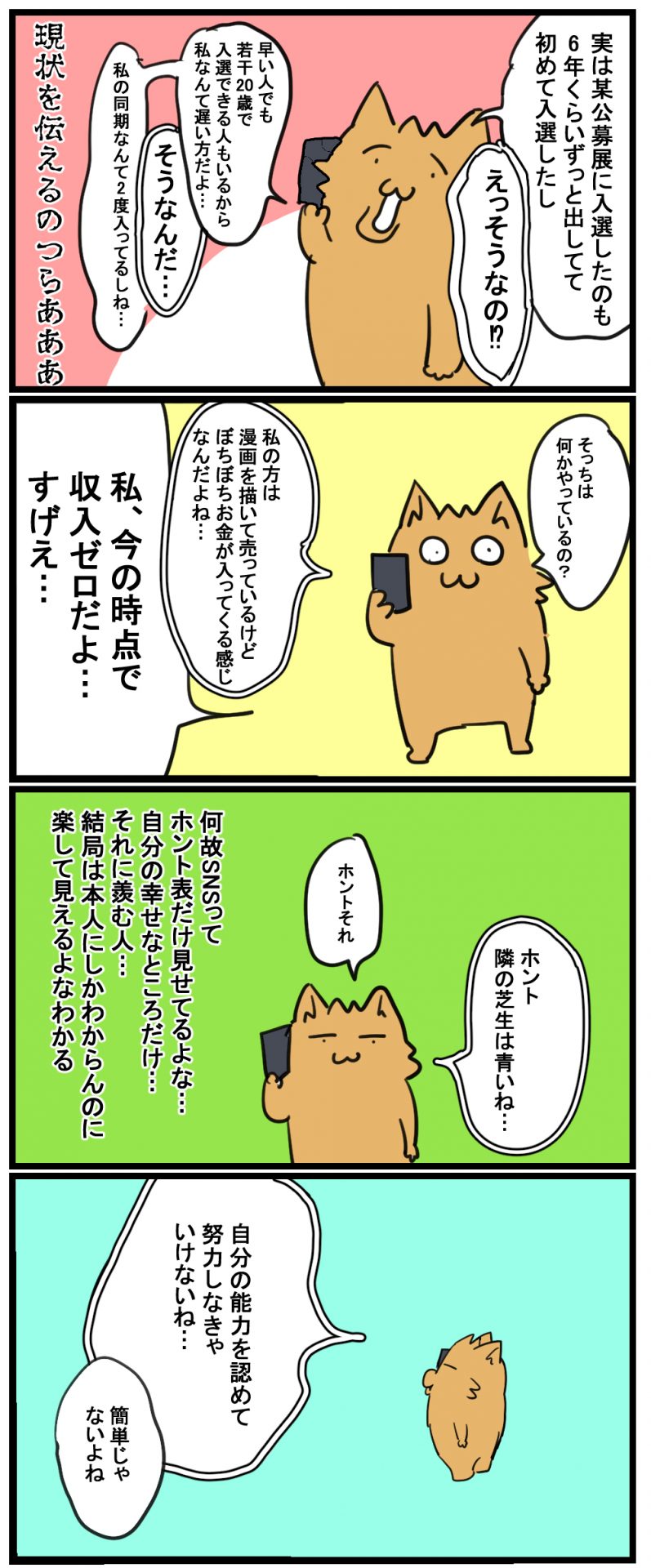 HOME > 仕事ネタ > 仕事ネタ 雑記 「劣等感」という負の感情に振り回された話②完 2020年5月23日 Post Share Pocket Hatena LINE URLコピー 前回はこちら [blogcard url="https://www.comeoishii.com/2020/05/14/post-2408/"] 二人で話した結果、、、 この名言がひたすらよぎる 全力でがんばろう 前回はこちら [blogcard url="https://www.comeoishii.com/2020/05/14/post-2408/"] 読んでいただきありがとうございました! ブログランキングに参加しています。 よろしければ押してくれるとうれしいです! 絵日記ランキング Post Share Pocket Hatena LINE URLコピー おすすめ記事 -仕事ネタ, 雑記 -おこめ, 仕事, 劣等感, 嫉妬, 日本画, 日本画家