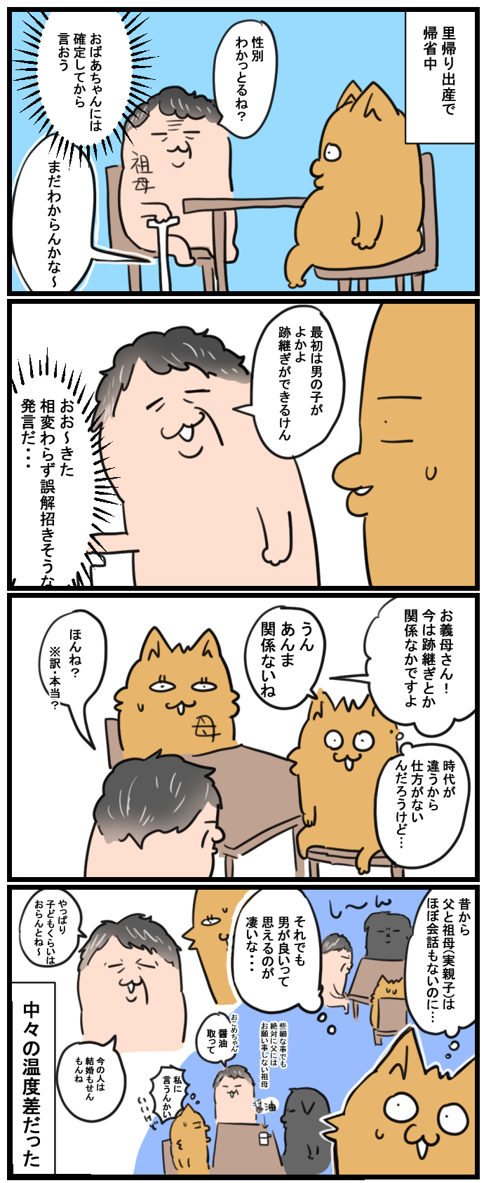 HOME > 家族ネタ > お父上氏 > お父上氏 妊娠ネタ 家族ネタ 母上氏 祖母に生まれてくる子どもの性別を聞かれた話 2021年4月14日 Post Share Pocket Hatena LINE URLコピー お父上氏と祖母も昔はちょっとくらい話していたんですが (お父上氏が寡黙なので元々喋らない) 言い方や考え方のすれ違いで今や会話ほぼゼロ・・・ 読んでいただきありがとうございました! ブログランキングに参加しています。 よろしければ押してくれるとうれしいです! 絵日記ランキング Post Share Pocket Hatena LINE URLコピー おすすめ記事 -お父上氏, 妊娠ネタ, 家族ネタ, 母上氏 -おこめ, お父上氏, 妊娠, 祖母