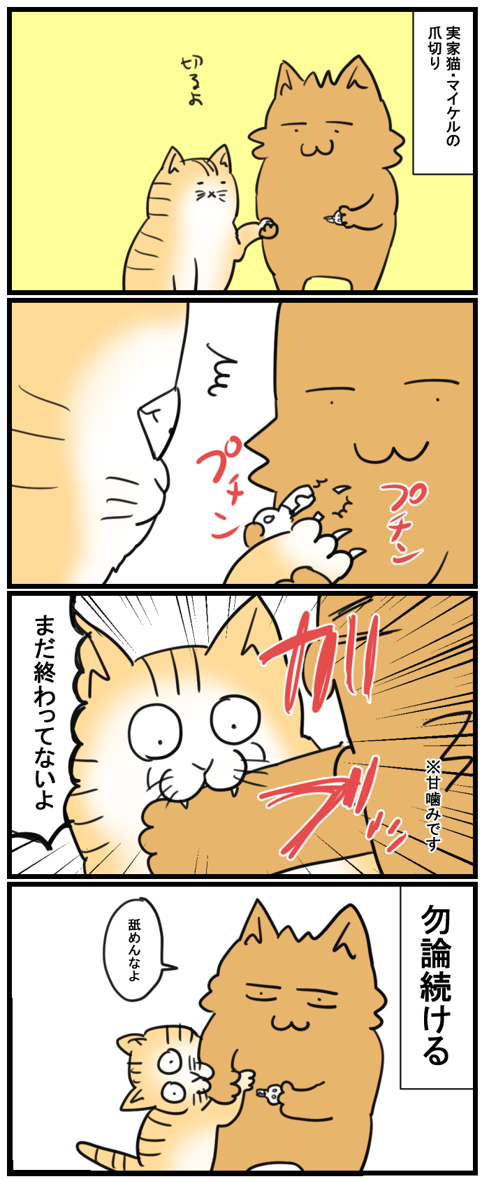 HOME > プライベート > プライベート 家族ネタ 実家猫の爪切りは命がけ 2021年5月5日 Post Share Pocket Hatena LINE URLコピー 噛まれても続ける こうなるとガチの怪我をするのでやめておく 読んでいただきありがとうございました! ブログランキングに参加しています。 よろしければ押してくれるとうれしいです! 絵日記ランキング Post Share Pocket Hatena LINE URLコピー おすすめ記事 -プライベート, 家族ネタ -プライベート, マイケル, 実家猫, 爪切り