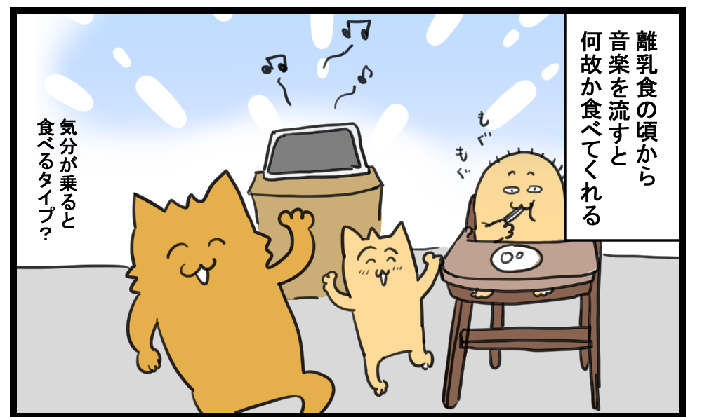 踊りながら子どもにご飯あげると「ま、いいか」ってなるのでおススメ。コト氏に効果あり。 子どもにもよります。おつぶには効果なし。